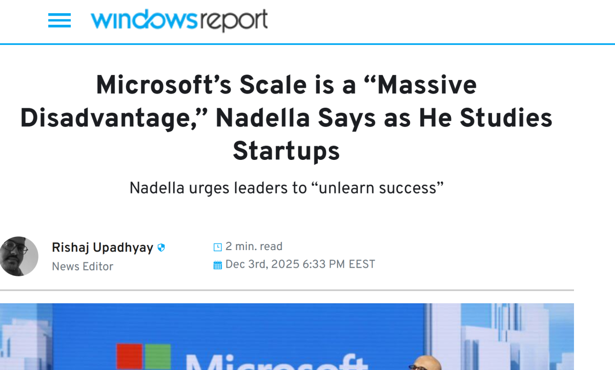 12月4日消息,据科技媒体 Windows Report 报道,微软CEO萨蒂亚·纳德拉在接受 Axel Springer CEO 马蒂亚斯・多普夫纳采访时直言,企业庞大的规模已成为其在AI竞赛中的“巨大劣势”,呼吁大型组织通过心态重塑、流程重构与技术革新,主动适配人工智能时代的发展要求。