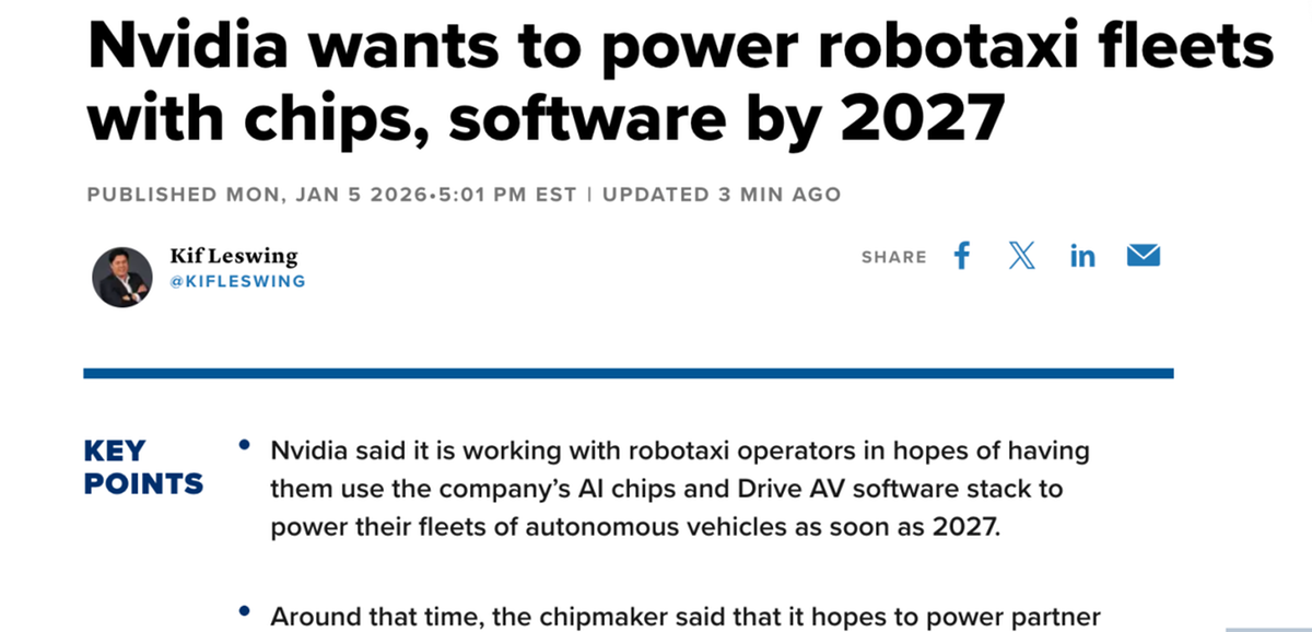 2025年10月,英伟达宣布与Uber达成自动驾驶出租车合作协议,双方将共同探索自动驾驶出租车市场。同年12月,英伟达宣布已成功开发出可为自动驾驶汽车提供动力的软件。并且,计划于2026年底发布的梅赛德斯-奔驰车型将能够借助英伟达的技术,在旧金山等城市实现自主导航。