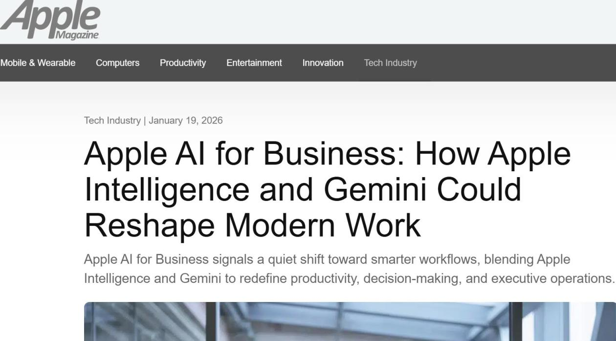 1月20日消息,据applemagazine报道称,苹果公司正通过将 Apple Intelligence 与 Google 的 Gemini 模型深度整合,推动一场静默却深远的企业级人工智能转型。这一战略并非以独立平台或复杂仪表盘形式呈现,而是将智能能力无缝嵌入用户日常使用的邮件、日历、文档、消息和会议工具中,重新定义现代企业的生产力、决策流程与运营效率。